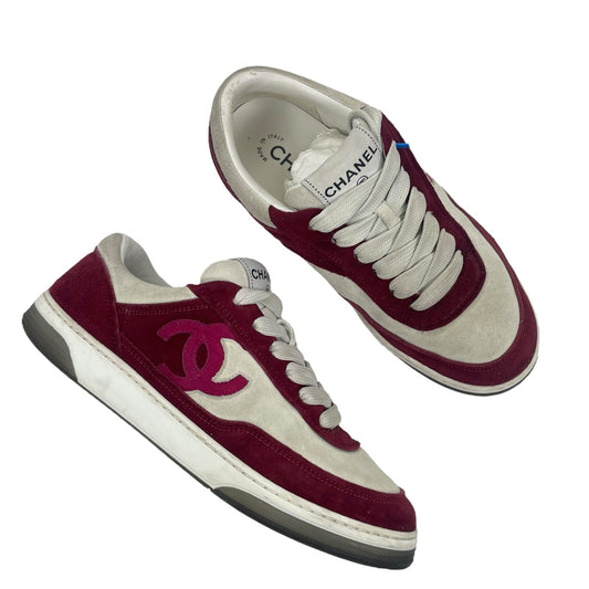 Chanel CC Logo Suede Kidskin Lace Up Sneakers Burgundy 2023 Size 36.5