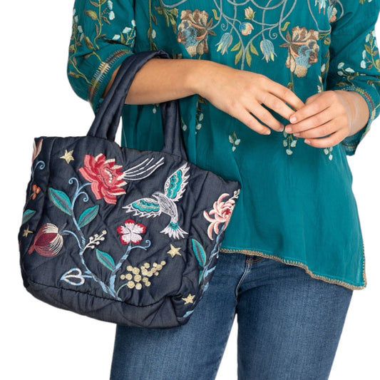 Johnny Was Viola Denim Quilted Tote Bag Embroidered Blue