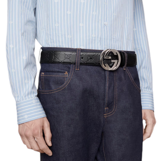 Gucci Interlocking G Buckle Signature Leather Belt GG Logo Black Size 90/36