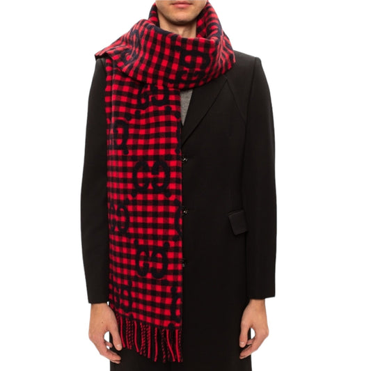 Gucci Diamcheck GG Logo Monogram Wool Jacquard Scarf Red Black 94"x 14"
