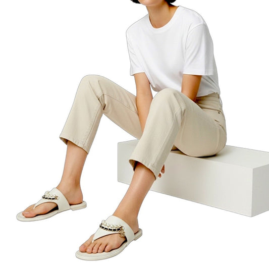 Chanel Pearl & Chain CC Logo Embellished Thong Sandal White Size 40