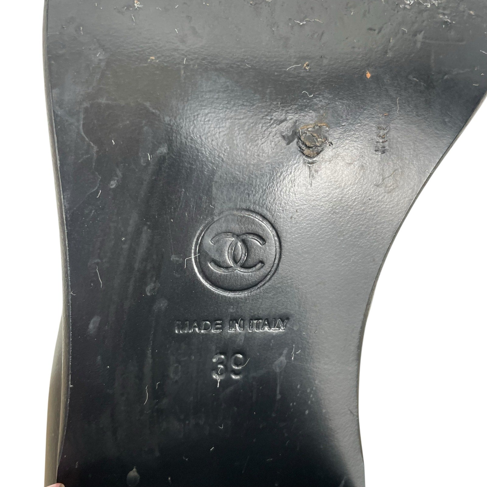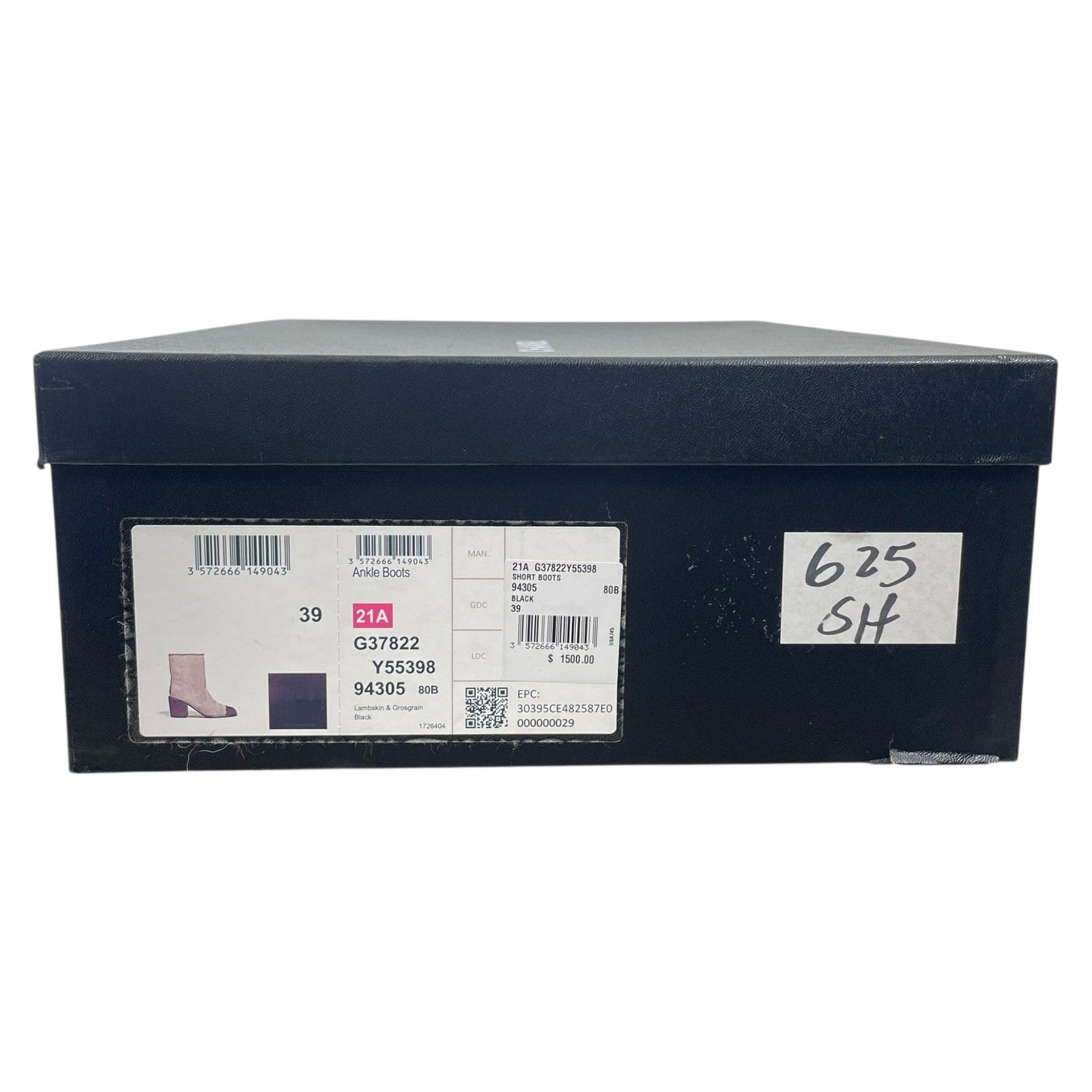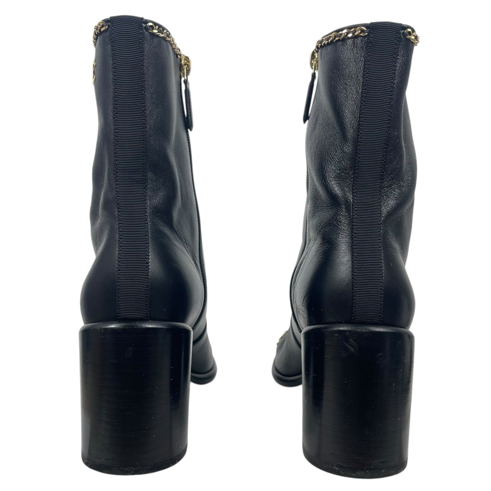 Style tags: Chanel, Coco Mark, logo boots, cap toe, chain detail, short boots, ankle boots, black leather, size 39, women’s designer boots, luxury fashion, classic Chanel, statement footwear, round toe, elegant edge, chic style, iconic branding, timeless design, high-end leather boots.