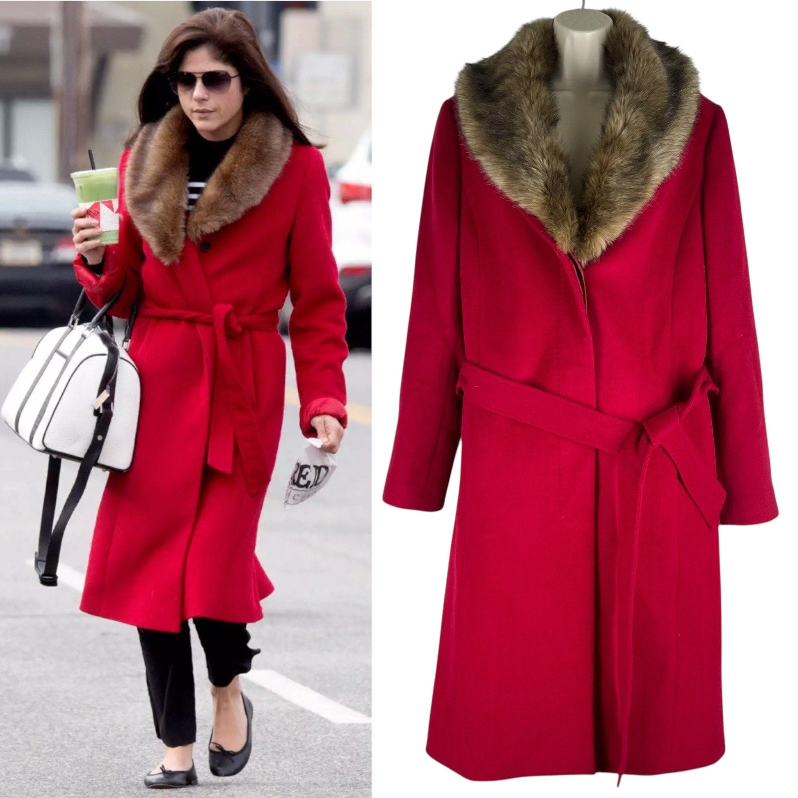 Talbots Wool Blend Belted Long Coat Removable Fur Collar Red Size 6